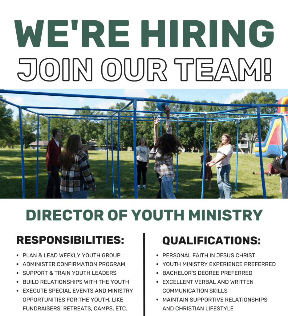 Living Word is hiring a full-time Director of Youth Ministry to create, plan, and lead programs designed to nurture and educate middle school and high school youth (grades 7-12). Ministry programs currently include, but are not limited to, high school Ignite and middle school Confirmation.